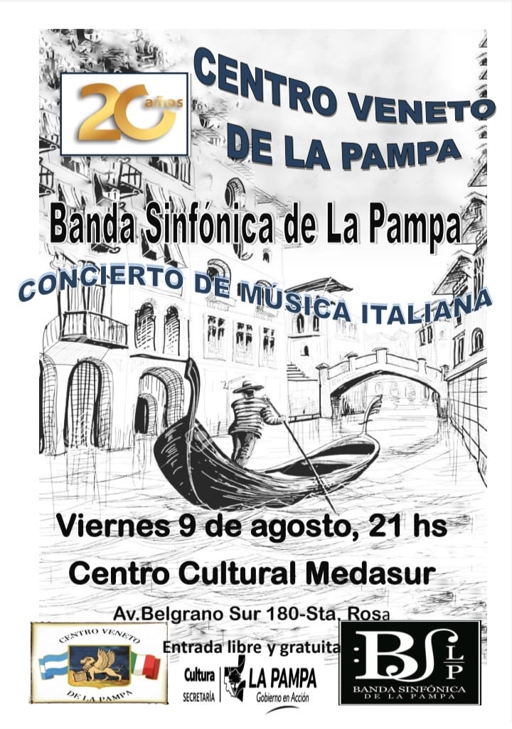 El viernes 9 de agosto la Banda Sinfónica de La Pampa presenta “Concierto de música italiana”, en el marco del 20 aniversario Centro Véneto de La Pampa.