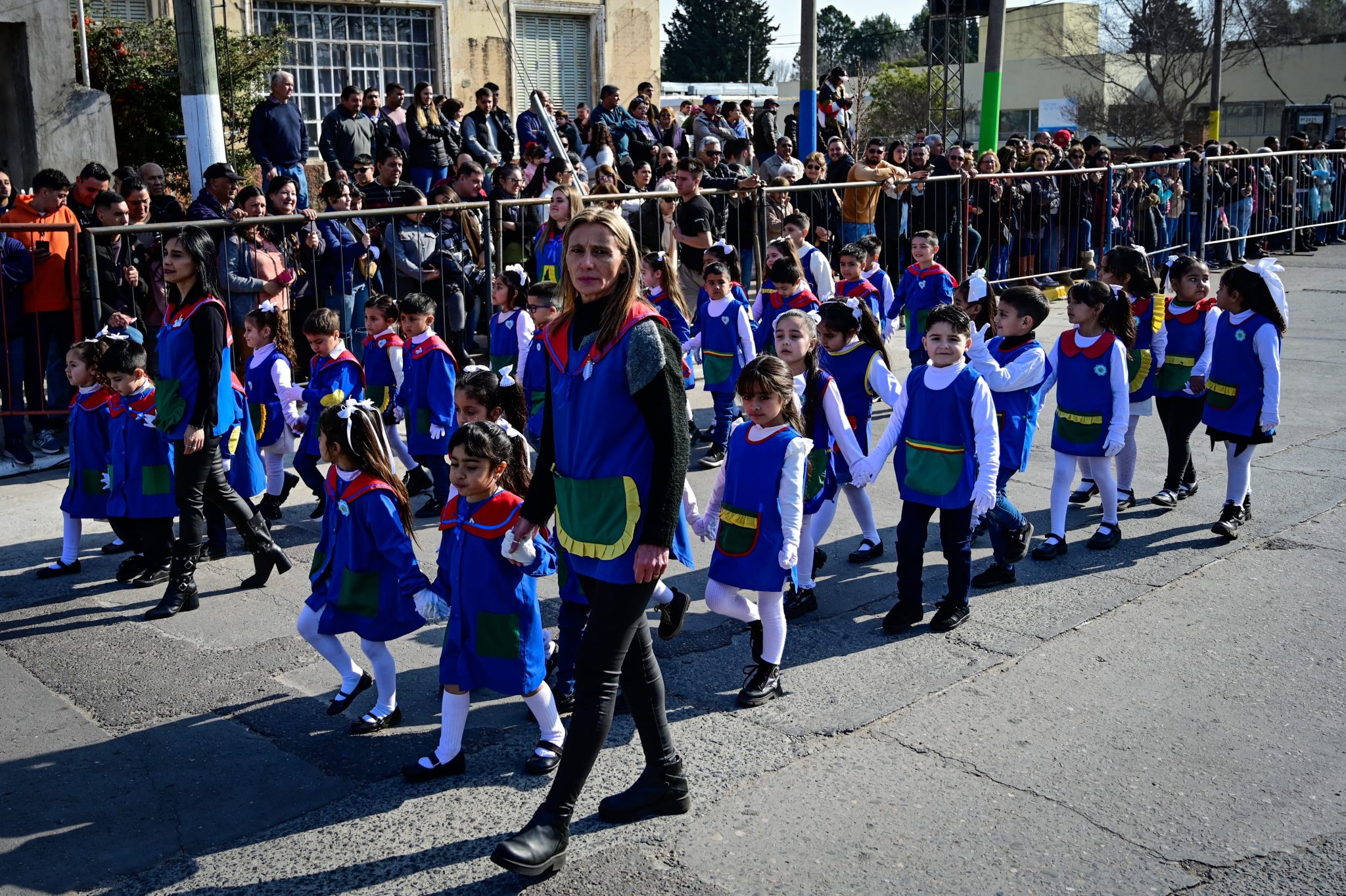 El desfile continuó con la pasada de 11 instituciones educativas. Estudiantes y docentes marcharon a un ritmo coordinado, con guantes, banderines y escarapelas. Alguno de los más pequeños caminaron tomados de las manos, otros fueron avanzando sosteniendo la enseña nacional.